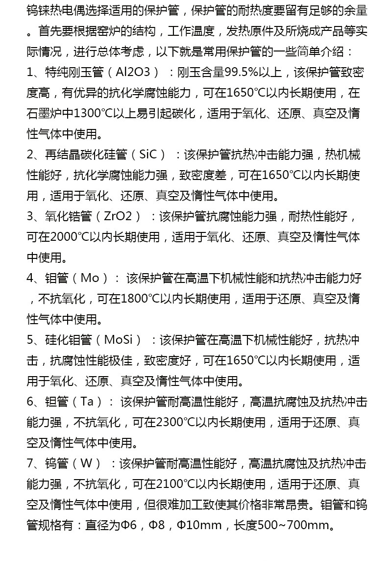 刚玉保护管测温:0-1800℃,钼管:0-2100℃,钨管:0-2300℃