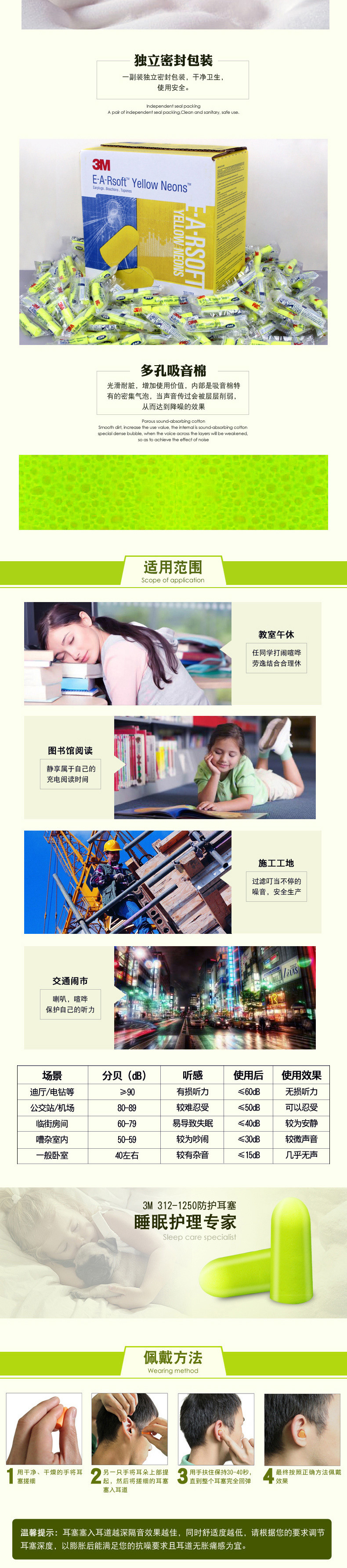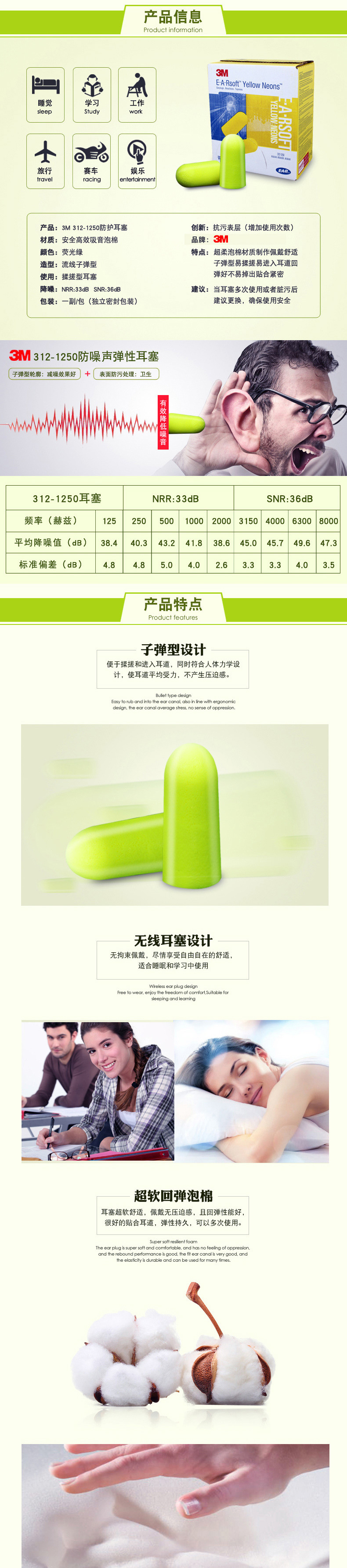 3M 312-1250 学习睡眠打呼噜飞机坐车隔音降噪防护耳塞