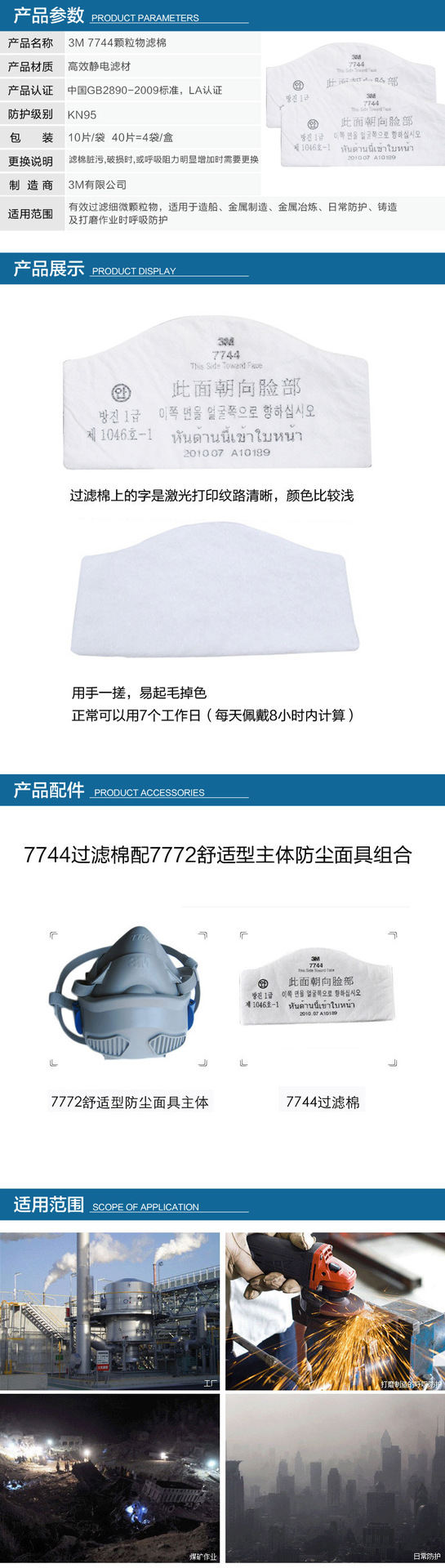 3M 7744 KN95 防颗粒物防工业粉尘过滤棉 搭配7772面具