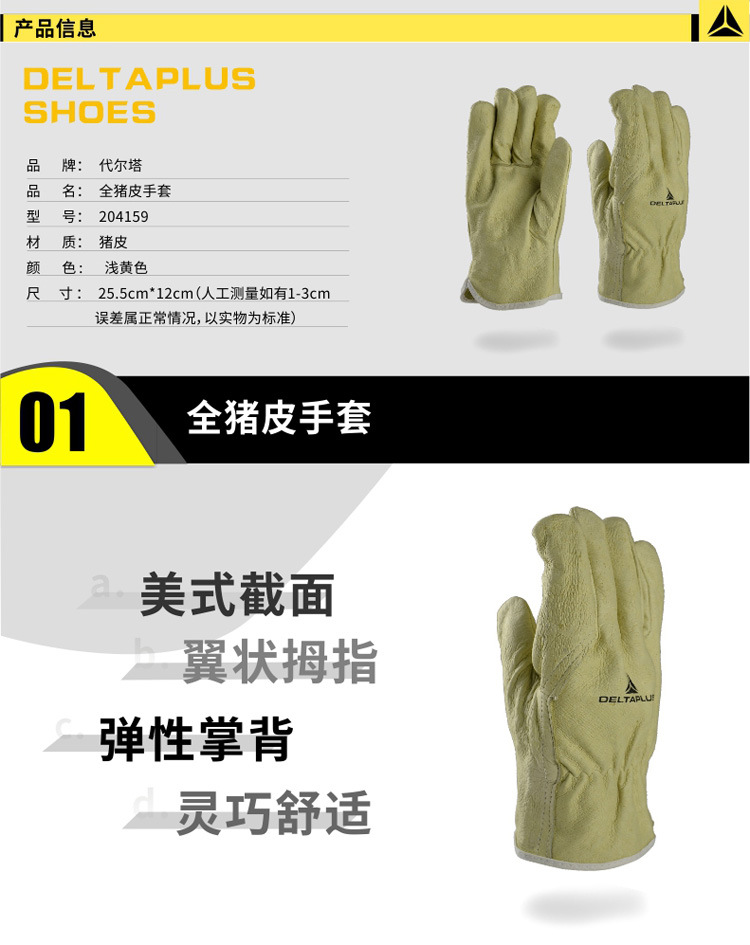 产品名称:代尔塔 204159 全猪皮搬运手套 耐磨透气灵巧机械修理防护手套