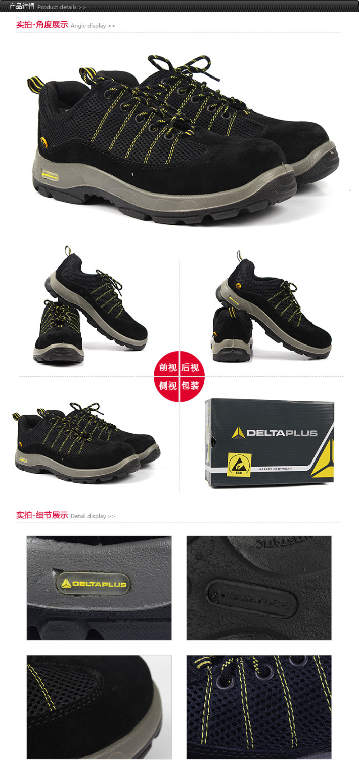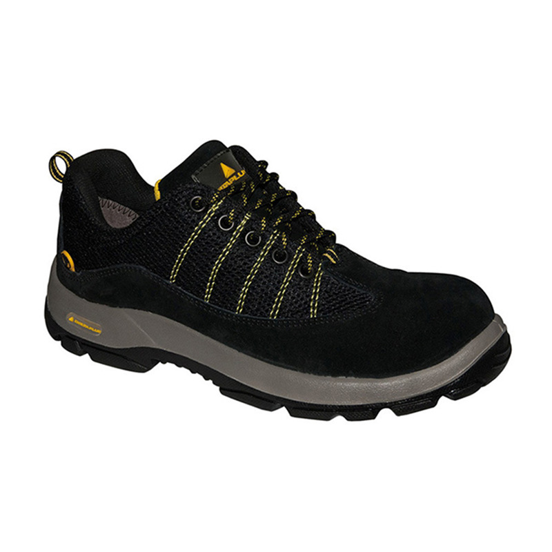 低帮牛皮轻便型代尔塔安全鞋。鞋面材料为毛面牛二层皮和尼龙网眼混合材质;衬里为聚酰胺材质;鞋垫为不可拆卸聚酰胺EVA材料;双密度PU注塑鞋底。带有钢包头和防穿刺中底。提供减震足跟保护和防滑鞋齿。