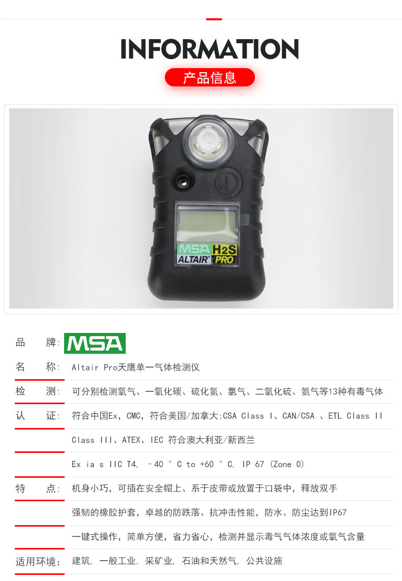 产品名称:梅思安MSA 8241007 Altair 天鹰单一气体检测仪 防跌落(HCN)