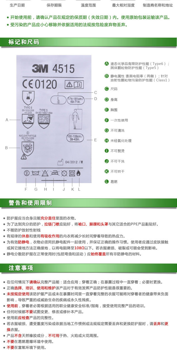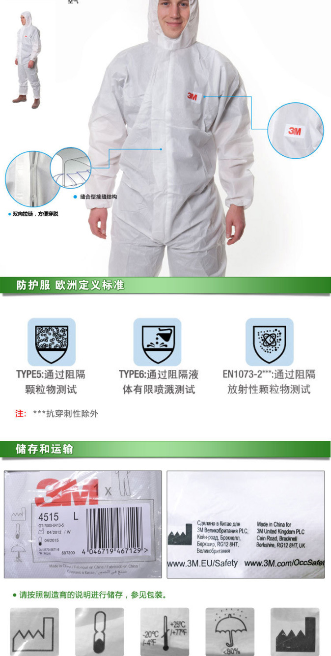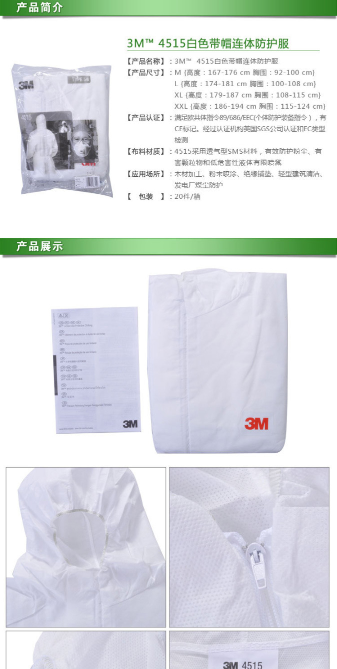 3M 4515 白色连体式带帽透气防护服喷漆打磨农药实验室防化服