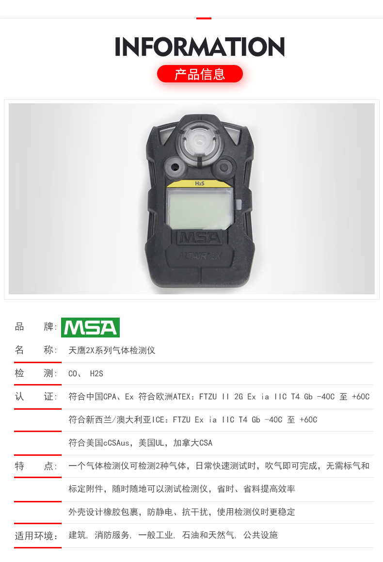 产品名称:梅思安MSA 10162581 天鹰2X便携式单一气体检测仪 H2S 炭黑外壳