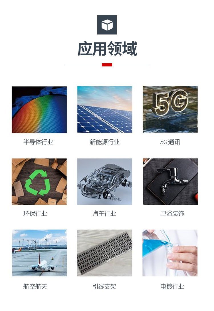 广泛应用于半导体行业、新能源行业、5G通讯、五金建材、航空航天、环保行业、汽车行业、卫浴装饰、精密电子、电镀行业等多种领域。