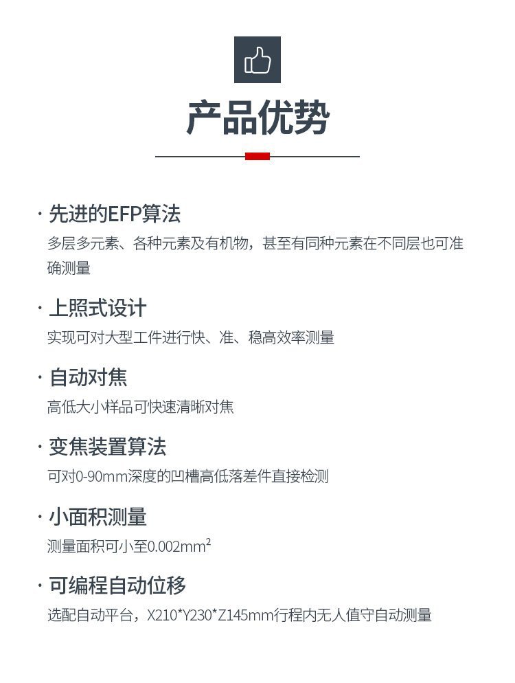 先进的EFP算法:多层多元素、各种元素及有机物,甚至有同种元素在不同层也可准确测量上照式设计:实现可对大型工件进行快、准、稳高效率测量自动对焦:高低大小样品可快速清晰对焦变焦装置算法:可对0-90mm深度的凹槽高低落差件直接检测小面积测量:最小测量面积0.002mm2可编程自动位移:选配自动平台,X210*Y230*Z145mm行程内自动测量
