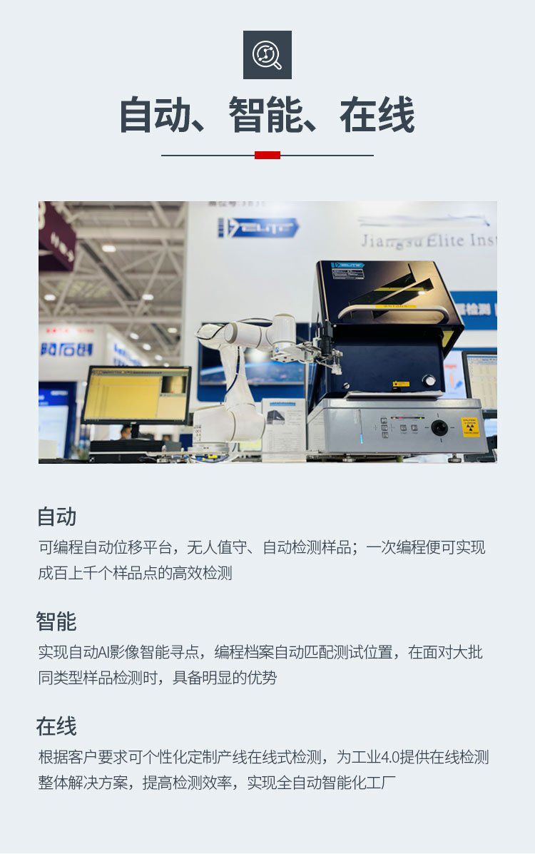 ● 自动、智能、在线检测自动:可编程自动位移平台,、自动检测样品;一次编程便可实现成百上千个样品点的高效检测智能:实现自动AI影像智能寻点,编程档案自动匹配测试位置,在面对大批同类型样品检测时,具备明显的优势在线:根据客户要求可个性化定制产线在线式检测,为工业4.0提供在线检测整体解决方案,提高检测效率,实现全自动智能化工厂