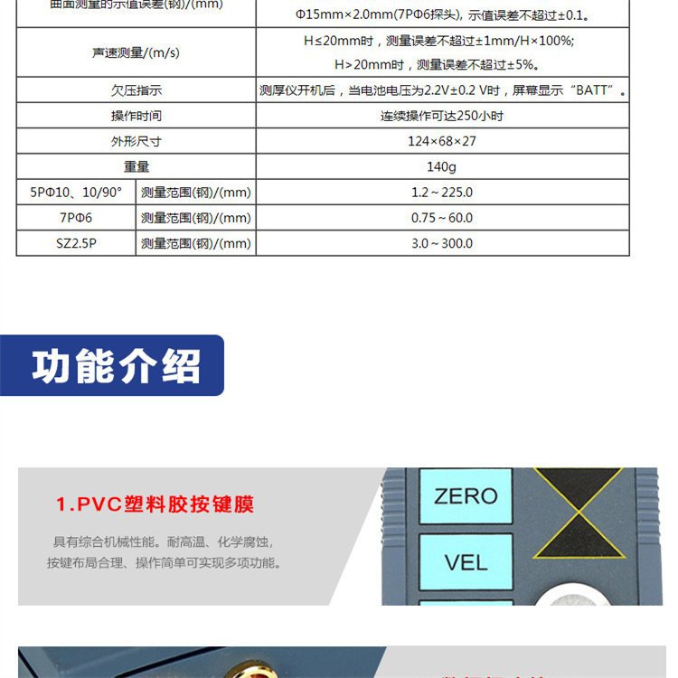 ● 采用上、下调节键可对声速、厚度进行快速调整,可快速查询厚度存储单元。
