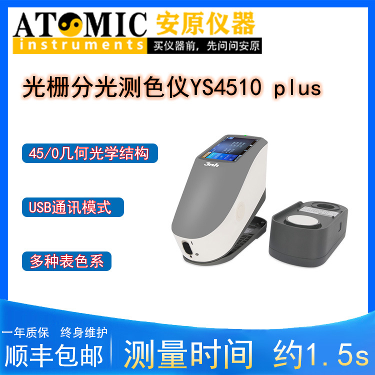 YS4510 plus通用型分光测色仪采用符合CIE No.15的45/0(45度环形照明,0度接收)几何光学结构,采用凹面光栅分光方式,可准确测量样品反射率及各种色度数据。用户可根据样品需求定制单一Φ8、Φ4、或Φ2mm测量口径,用于交通路标、塑胶电子、油漆油墨、纺织服装印染、印刷、陶瓷等行业准确颜色测量和品质控制。