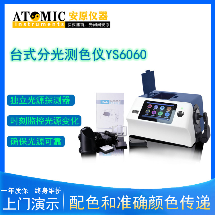 YS6060是3nh公司独立开发的完全拥有自主知识产权的国产台式光栅分光测色仪, TFT真彩7inch电容触摸屏、全光源、照明方式:反射D/8°、透射D/0°(包含UV/排除UV测量) 测量颜色准确稳定、存储容量大、PC端强大扩展功能,用于实验室颜色准确分析与传递。