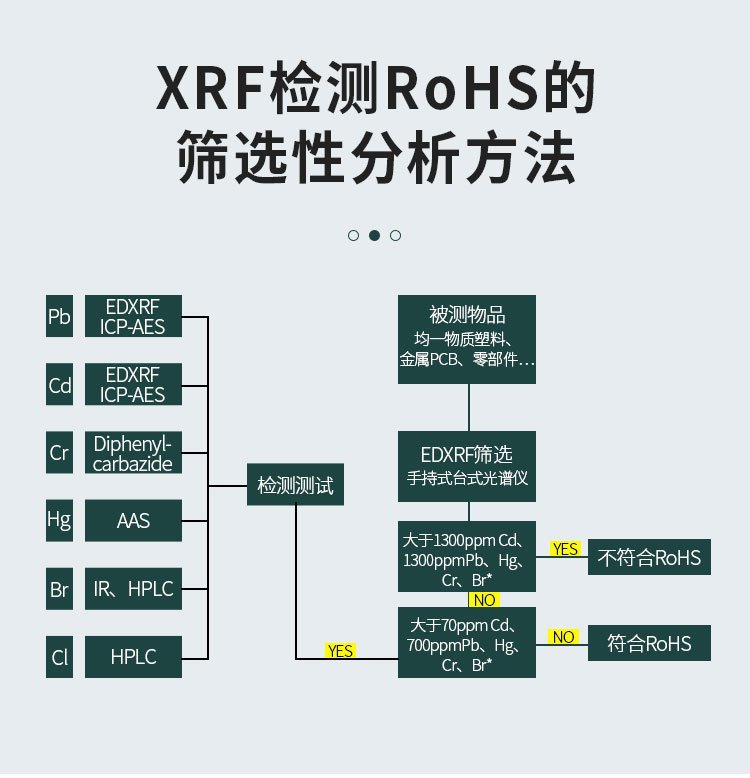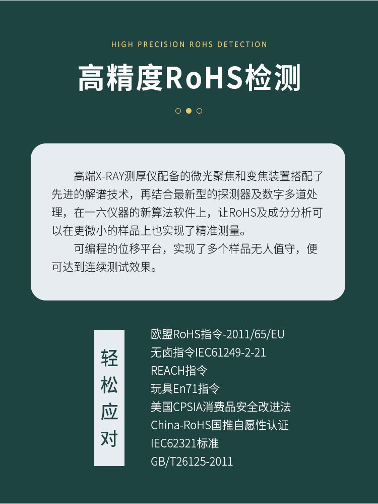 行业应用:RoHS检测应用RoHS(卤素)是由欧盟立法制定的一项强制性标准,主要用于规范电子电气产品的材料及工艺标准,目的在于消除电子电气产品中的铅、汞、镉、六价铬、多溴联苯和多溴联苯醚共6项物质,并重点规定了铅的含量不能超过0.1%。国标SJ/T 11365-2006《电子信息产品中有毒有害物质的检测方法》对RoHS要求中有害元素测试方法给予了限定。其中X射线荧光光谱法(XRF)作为一种快捷、方便的方法被制定为快速筛选方法。使用X射线荧光光谱法(XRF)可对铅(Pb)、汞(Hg)、镉(Cd)、铬(Cr)、溴(Br)、氯(Cl)等元素进行测试。XAU是安原仪器结合RoHS(卤素)检测标准及客户需求,自主研发的一款RoHS(卤素)检测仪,采用X射线荧光光谱检测技术,引进高性能Si-PIN半导体探测器,大大提高了检测范围及精度,可准确检测铅、汞、镉、总铬、总溴等有害重金属物质,广泛应用于电子产品生产、玩具制造、五金制造、海关、质检机构等领域。
