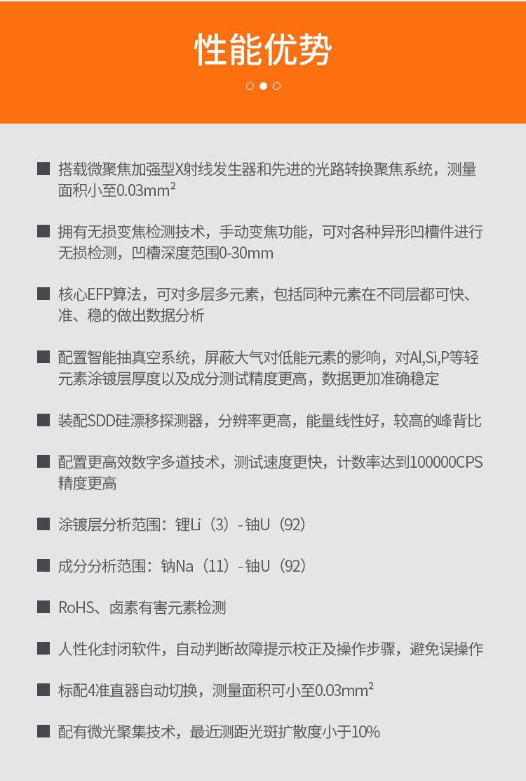 1)搭载微聚焦加强型X射线发生器和先进的光路转换聚焦系统,最小测量面积达0.03mm2