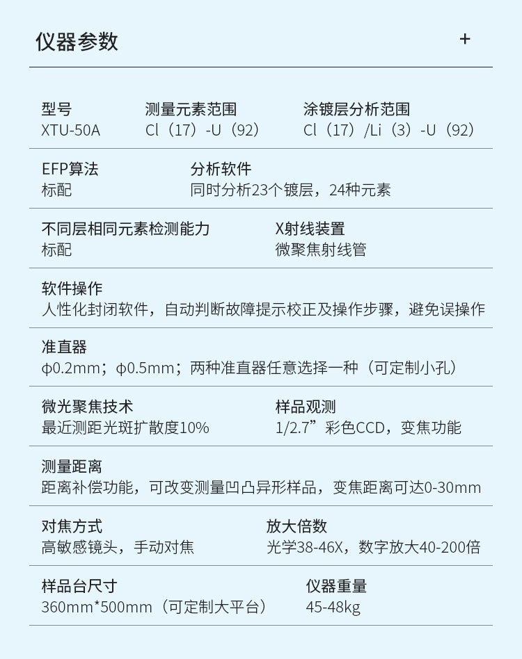 4)配置智能抽真空系统,屏蔽大气对低能元素的影响,对Al,Si,P等轻元素涂镀层厚度以及成分测试精度更高,数据更加准确稳定