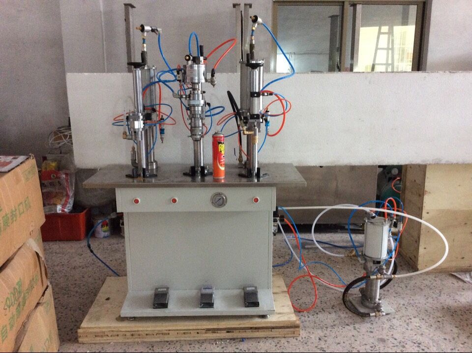 该机由原半自动气雾剂灌装机经过改进,优化,集成而来。将半自动灌液,封口,充气三台机器安装在一个工作台上。只需一人操作脚踏阀一次即可同时完成所有动作。速度快,精度高,稳定性好,省时省力,是中小型气雾剂生产厂家的理想选择。