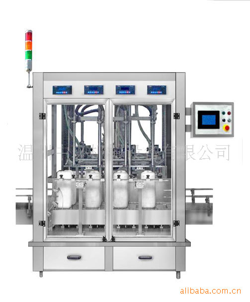 | ZH-CZ-4液体称重灌装机 本机适用于对流体10kg~50kg的计重量灌装,自动完成计数进瓶、计重量灌装、输送出瓶等一系列操作。特别适用于水剂、食用油、润换油的定量灌装,是食品、医药、化妆品以及精细化工等行业的理想包装机。 主要特点 ◆本机采用可编程控制器(PLC)、触摸屏进行操作控制、使用调节方便。 ◆每个灌装头均有称重和反馈系统,能对每一个头的灌装量进行灌装量设置和单个微量调整。 ◆光电传感器、接近开关等采用的都是先进的传感元件,做到无桶不灌装,堵桶主机会自动停机并报警。 ◆灌装方式为下潜式,可有效减少泡沫的产生,可以满足不同特性物料的灌装。 ◆整机按GMP标准要求制作,各管路连接采用快装方式,拆卸清理方便快捷,与无聊接触部位及外露部分均采用不锈钢材料制造。整机安全、环保、卫生、美观、能适应各种不同环境的工作。 ◆此灌装机适用于10kg 到50kg 液体。 ◆ 各灌装头都有反馈系统,可以分别调整。 ◆ 采用PLC以及触屏控制。 ◆ 采用潜入式灌装减少泡沫。 主要技术参数 外形尺寸:2500mm(长)×1700mm(宽)×2300mm(高) 灌装头数:4头 适用瓶型:长度:160mm~360mm 宽度:140mm~260mm 高度:250mm~500mm 桶口直径:≥φ40mm 包装规格:5L~50L 生产能力:≤400桶/小时 计量误差:±15ml 配备电源:220V;50Hz 主机功率:3KW 配备气源:0.55Mpa~0.65Mpa洁净稳定气源 ZH-CZ-4 Weight Filling Machine This weighing filling machine is for filling 10kg to 50kg liquid. It automatically achieves counting inlet bottle, gravity filling, and bottle outlet. It is especially good for filling SL, edible oil and lubrication. It is a nice choice for foodstuff pharmacy, cosmetic and chemical industries. Major Characteristics: ◆This weighing filling machine is for filling 10kg to 50kg liquid.. ◆ Each filling head has the weigh and feedback system, each filling head can be regulated ◆This type filler adopts PLC to control, touch screen control panel ◆ It applies dive method to fill and it reduces foam. ◆ This machine adopts PLC and touch screen control panel, so it is convenient to set. ◆ Each filling head has the weigh and feedback system, each filling head can be regulated. ◆ Photoelectric sensor, approximate switch and other electric elements are of the international famous brands. It ensures no container miss filling. The host machine will alarm if there is any container blocked. ◆It applies dive method to fill and it reduces foam; it is suitable for various kinds of filling products. ◆ The whole machine meets GMP standard, it is easy to clean and maintain, and the parts which contact with the filling material are made of high quality stainless steel. The whole machine is safe, eco-friendly and sanitary. It adapts to various kinds of working places. Main Performance parameter: Outline Dimension (L×W×H):2500mm×1700mm×2300mm Number of filling Head:4 Suitable bottle:Length:160mm~360mm Width:140mm~260mm Height:250mm~500mm Diameter of bottle mouth:≥Φ40mm Suitabe range:5L~50L Production capacity:≤480bottles/hour(tested by water) Filling Error:±15ml Voltage:220V;50Hz Power of host machine:3kw Pneumatic (air-operated) source:0.5Mpa~0.65Mpa clean and Stably compressed air