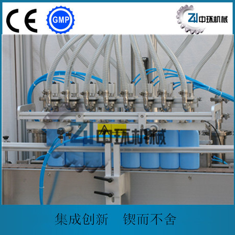 工作流程:本机采用电控气缸作灌装动力,灌装容器至输送台左端在输送链板的作用力下输送到指定位置后,定位气缸进行定位,升降气缸下行,灌装嘴潜入并灌装,灌装量及灌装时间均按设定有序进行,经一定延时后升降气缸上行,定位气缸复位,装有定量液体的容器经输送至右端从而完成一个工作循环。