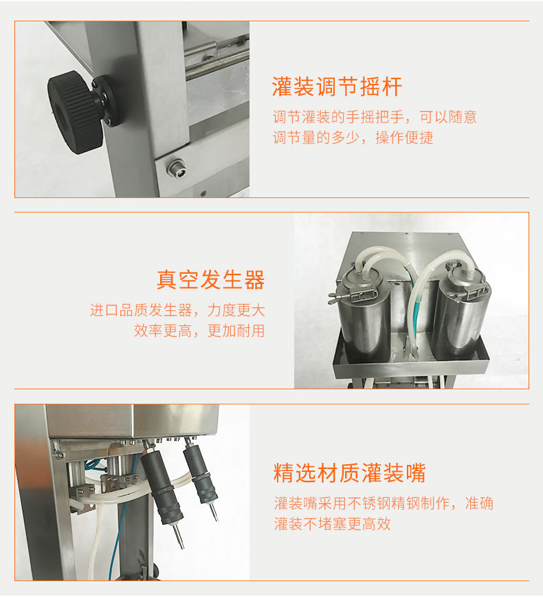 ZHYW双头液位控制液体灌装机是负压式半自动灌装机,主要用于花露水、香水、润滑油、洗洁精等液体物料灌装;有双头、四头两种机型,它具有定液面方式计量性能,液面高度可以调节,本机结构紧凑合理,操作简单,维护方便,与物料接触的零部件用304不锈钢制作。适用于玻璃瓶和抽真空后不易变形的塑料瓶等容器的灌装。