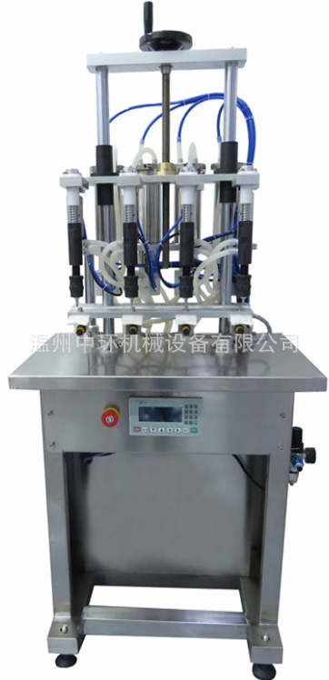 | ZH-F4 香水灌装机 ZH-F4型香水灌装机,用于花露水、香水和其它水性物料的灌装。本机采用负压、定液面方式灌装,有四头和六头两种规格。根据用户需要,可提供防爆型。 特点: ◆负压吸液灌装,产品灌装量以液面高度为计量方式。 ◆装有脚轮,移动方便。 ◆与物料接触零件及台面均用304不锈钢材质。 ◆适用于玻璃瓶,或抽真空后瓶体不易变形的塑料瓶。 ◆调整、操作、维修方便。 技术参数: 生产能力: 10-40 瓶/分 灌装量: 5-1000ml 使用瓶高度: 250mm 适用瓶直径: 90mm 使用瓶口直径: 5mm 电源电压: 3/N AC380V/220V 耗电功率: 0.55KW0.75KW 防爆型 噪音: 70bB(A) ZH-F4 Perfume filling machine ZH-F4 model perfume filling machine is used for filling floral water, perfume and other water-based materials. The machine adopts negative pressure and fixed liquid surface type filling. It includes two kinds of specifications such as four-head and six-head. Explosion-proof type products can be provided according to user requirements. Features: ◆ Negative pressure liquid sucking filling. The filling volume is measured according to liquid level. ◆ Caster wheels are installed for convenient movement. ◆ The parts and table surface that contact the materials are all made of 304 stainless steel. ◆ Suitable for glass bottles, or plastic bottles whose body will not be easily deformed after vacuum extracting. ◆ Convenient adjustment, operation and maintenance. Technical Parameter: Productivity: 10-40 Filling volume: 5-1000ml Height of using bottle body: ≤250mm Applicable bottle diameter: ≤90mm Diameter of bottle mouth: ≥5mm Supply power: 3/N AC380V/220V Power consumption: 0.55KW0.75KW (explosion-proof type) Noise: 70bB(A)