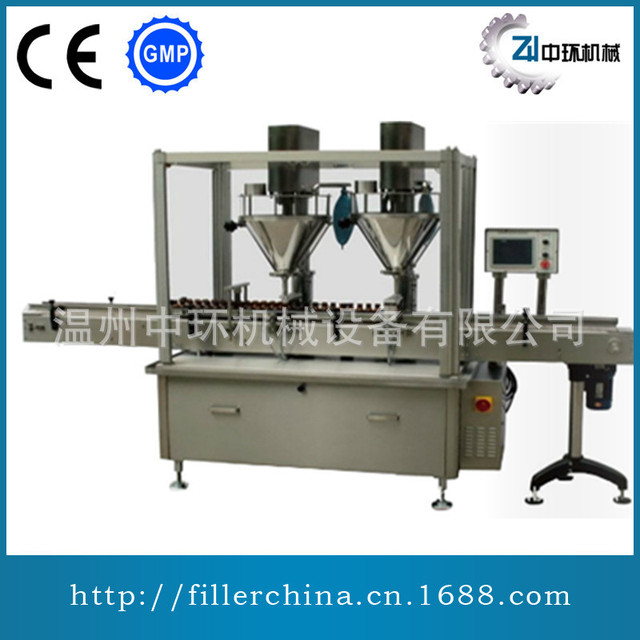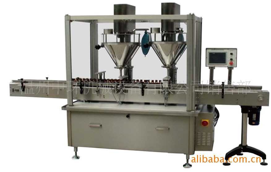 | ZH-GZF500 全自动粉剂灌装机 主要特点 该自动充填包装机适用包装粉粒状物料。如奶粉、米粉、白糖、咖啡、味精、固体饮料、葡萄糖、固体医药等。 ◆中/英文触摸屏人机界面,PLC控制系统,伺服电机驱动螺旋。 ◆使用或瓶状容器包装,配置自动喂罐系统,可实现无瓶、缺瓶不灌装。 ◆开门料箱,人性化易洗框式机架,整机结构、布局合理,更换包装品种,清理卫生及为方便。 ◆称重反馈比重跟踪,重量超差报警、故障报警提示和排废功能,确保产品合格率。 ◆工作数据可储存,备后使用,多可储存10个工作参数。 有托罐、振动、吸尘功能。 主要技术参数 填充重量: 50-250g 包装精度: ≤±0.3-1%(视被充填物的特性和重量的变化而定) 包装速度: 单头25-30瓶/分 双头40-50瓶/分 电源/功率: 220V 50-60HZ 2kw 整机重量: 600kg ZH-GZF500 Automatic Can Feeding Filling and Packing Machine Feature The machine is suitable for packing powdery &grainy product, for instance, milk powder, monosodium glutamate, solid beverage, icing sugar, dextrose, feed, coffee, solid medicament, powdery & grainy additive, dye, etc. ◆Chinese /English touch screen and HMI, PLC control system, auger is drived by servo motor. ◆Equipped with automatic can/bottle feeding system, implement to the functions of no-can-no-filling. ◆Open-door hopper, a frame type machine be designed the humanization to easily wash. Reasonable mechanical structre, easy to change size parts and clean up. ◆The functions of over-weight warning, error message display and failed packs detecting & deleting, which never let any reject to pass through, ensure the packing quality. ◆Max. 10 recipes can be saved for later using. ◆Have the functions of can support, vibration and dust extraction. Technical Parameter Filling Weight: 50-250g Packing Accuracy: ≤±0.3-1%(According to packing weight and product specs) Packing Speed: 25-30 can/min(one head), 40-50 can/min(two heads) Power Supply/Total Power: 220V 2kw Use Tolerance/Air Pressure: 0.2m3/min 6-8kg/m2 Total Weight: 600kg