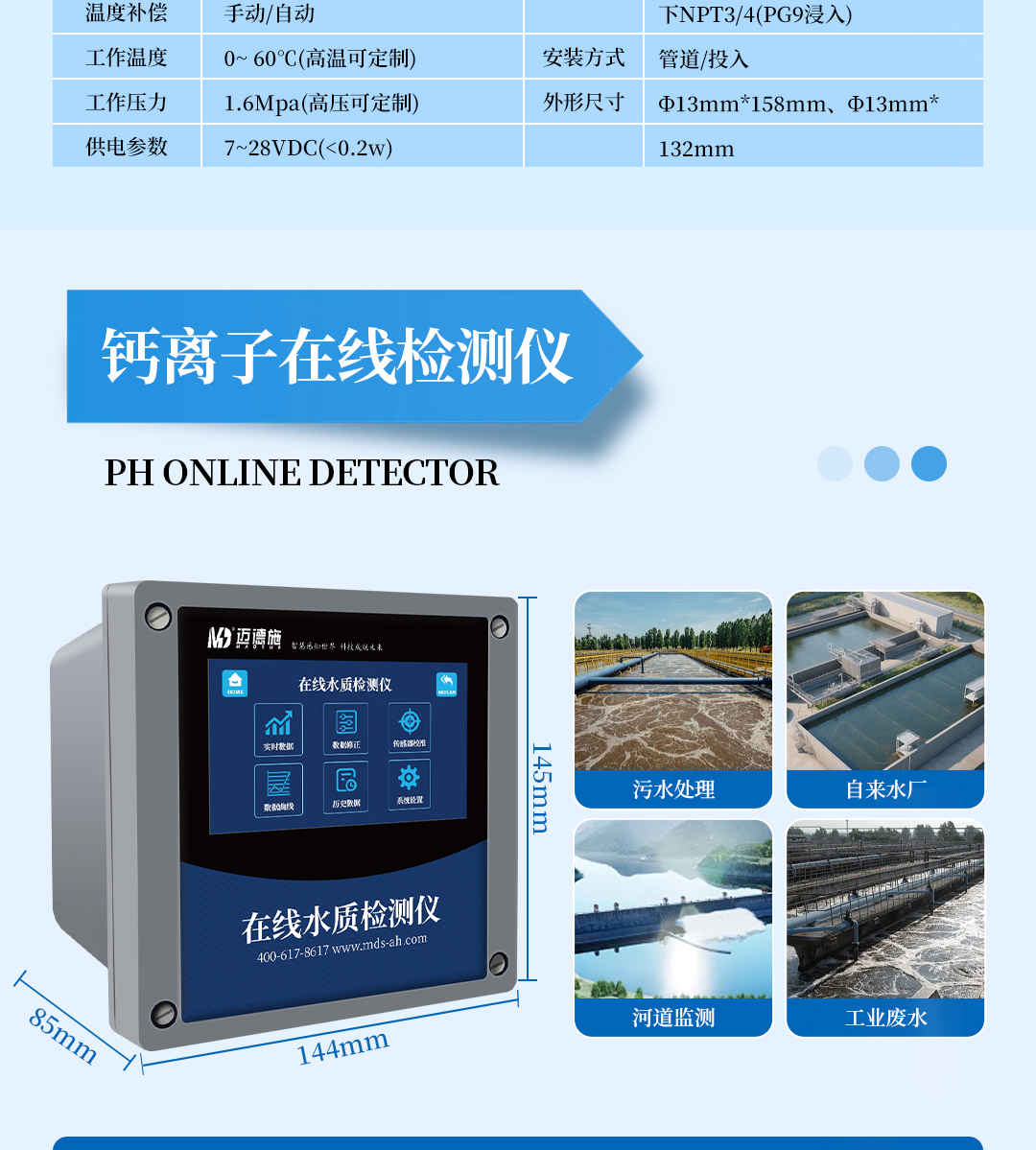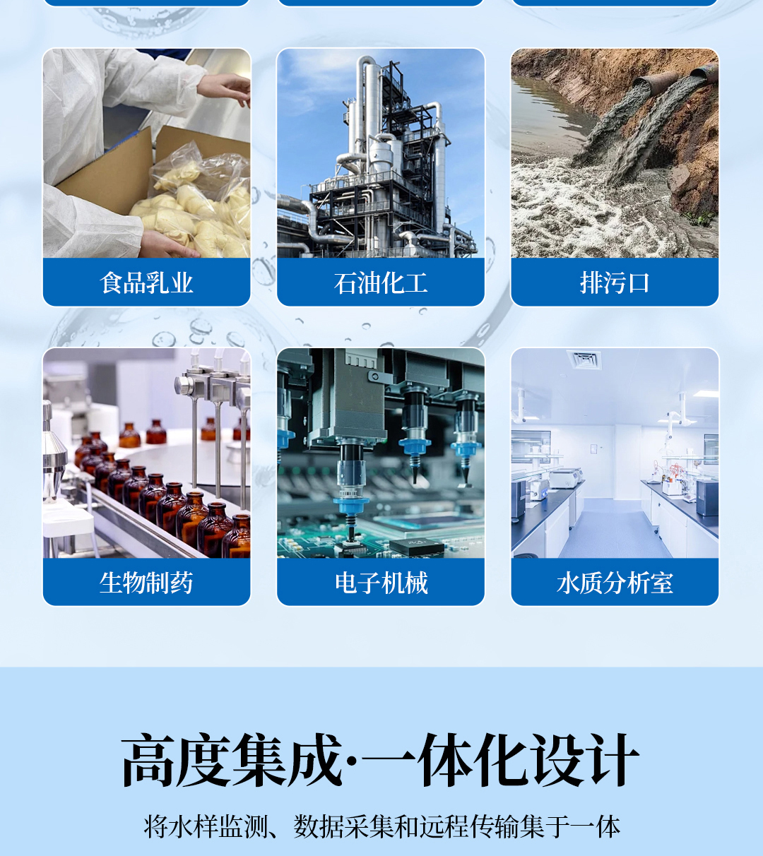 水环境自动监测站、污水处理厂、自来水厂、冶金钢铁生物制药、食品乳业、石油化工、电子机械、水产养殖等领域 |