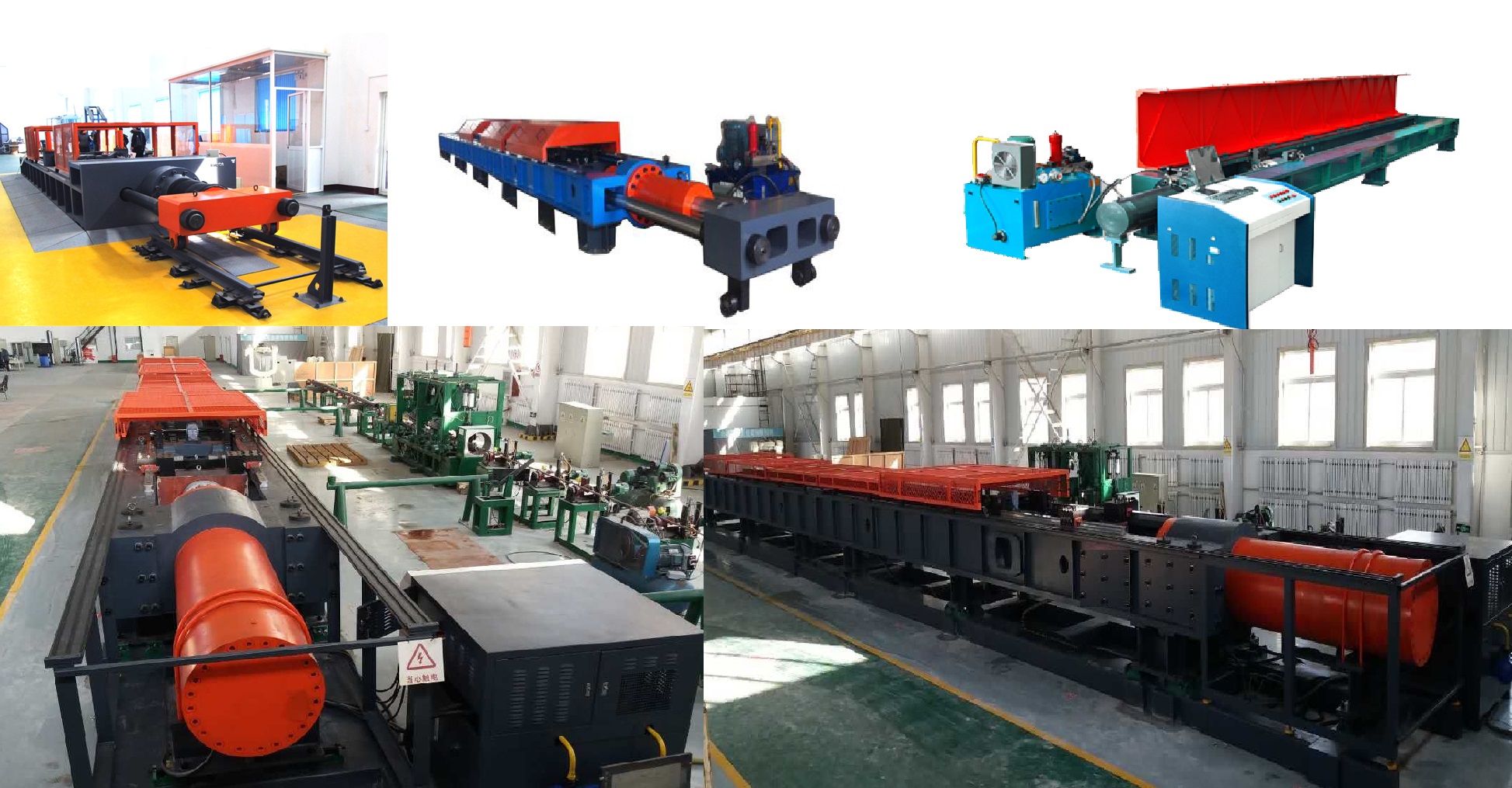 移动横梁及前后夹头座通过导轮支撑在导轨上,并可沿导轨前后移动,通过限位开关来控制移动的极限位置。移动横梁及前夹头座的移动由液压系统驱动,移动速度由液压系统的伺服阀控制。