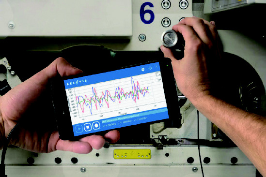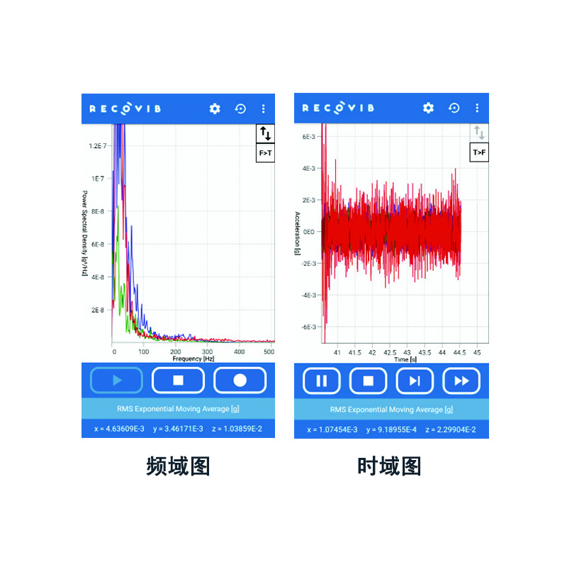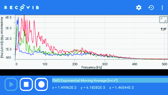RECOVIB.Feel 设计用于执行即时振动分析。它通过 USB 连接连接到 Android 设备或平板电脑。提供的应用程序可以在时域和频域中的图表上实时流式传输振动数据。在流式传输时,可以记录振动数据,以便在智能手机或 PC 上的数据查看器中重放振动数据。查看器允许对时域和频域中记录的振动进行详细分析。