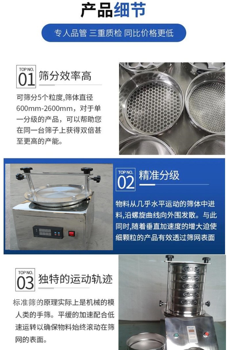 石粉标准分样筛 实验室试验筛 药粉标准分析筛广泛应用于建材、冶金、化工等行业的中粗粒度检测(如砂石粒径分级、金属粉末粗筛),试验筛是对物料颗粒进行粒度筛分、取样、检测、分析的仪器。主要由顶盖、圆手柄、紧顶手柄、螺杆、振动托盘、振动电机、等组成。
