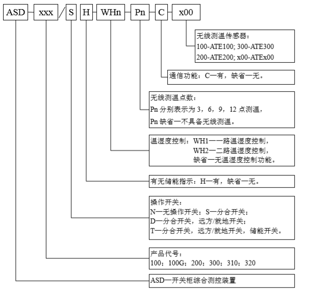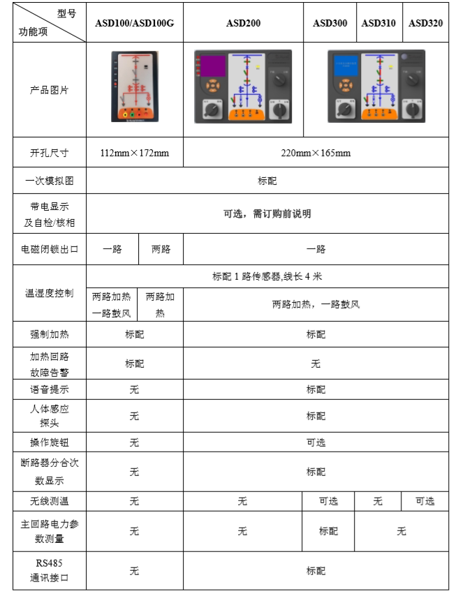 ASD 系列开关柜综合测控装置用于 3~35kV 户内开关柜,适用于中置柜、手车柜、固定柜、环 网柜等多种开关柜。具有一次回路模拟图及开关状态指示,高压带电显示及核相,自动温湿度控制, 加热回路故障告警,无线测温,人体感应自动照明,语音提示,电参数测量及 RS485 通讯接口等众 多功能,集操作、显示于一体。产品按功能分为 ASD100、ASD100G、ASD200、ASD300、ASD310、 ASD320 六种型号。