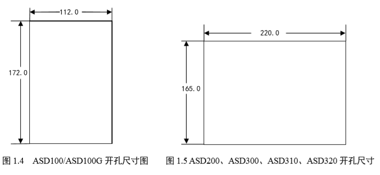 ASD 系列开关柜综合测控装置采用面板嵌入式安装,首先柜体盘面上制作规定尺寸的长方形槽 孔,装置取下支架后嵌入槽孔,再用支架固定即可。