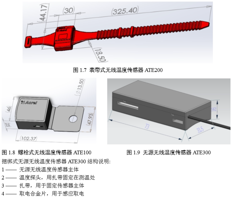 1.5.4 无线温度传感器的安装 无线温度传感器共有3 种,分别对应螺栓固定、表带固定、扎带捆绑三种安装方式。螺栓式适 用于电缆与母排搭接处,电缆与隔离刀闸搭接处使用;表带式适用于断路器动触头、静触头、电缆 接头、母排等处使用;扎带捆绑适用于动触头,母排,电缆,母排、电缆搭接处等多种场合。