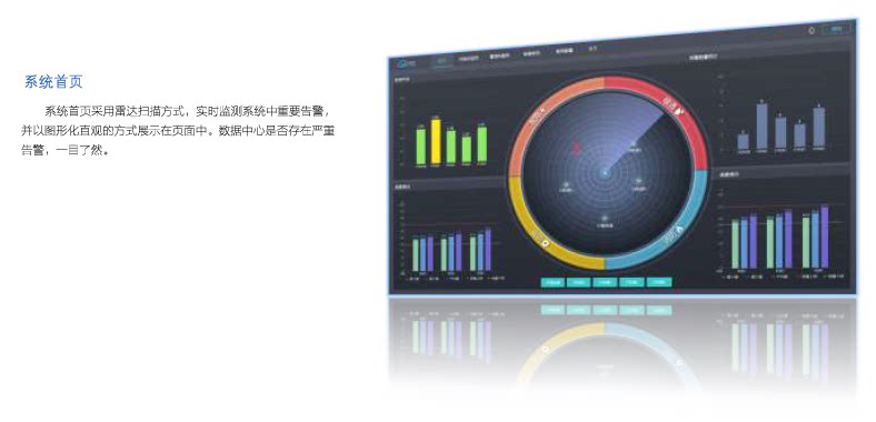 系统首页采用雷达扫描方式,实时监测系统中重要告警,并以图形化 直观的方式展示在页面中,数据中心是否存在严重告警,一目了然。