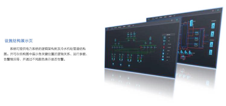 系统可提供电力系统的逻辑架构图及冷水机组管道结构图。并可在结 构图中展示各关键位置的逻辑关系、运行参数、告警情况等,并通过不同颜色表示是否告警系。