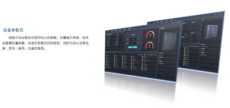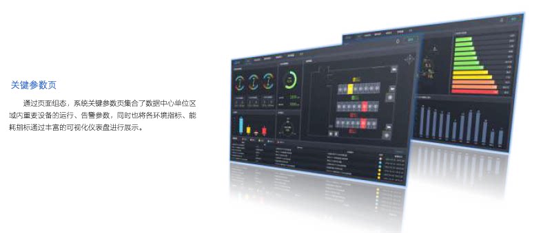 通过页面组态,系统关键参数页集合了数据中心单位区域内重要设备 的运行、告警参数,同时也将各环境指标、能耗指标通过丰富的可视化仪表盘进行展示。