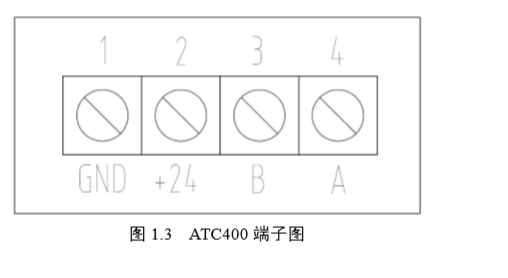 无线测温收发器 ATC400 接线端子。1、2 号为 DC24V 电源端子,3、4 为 RS485 接口。