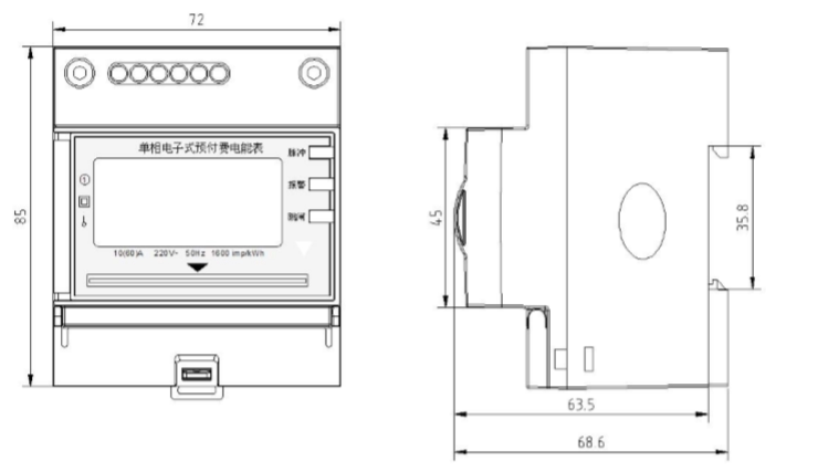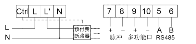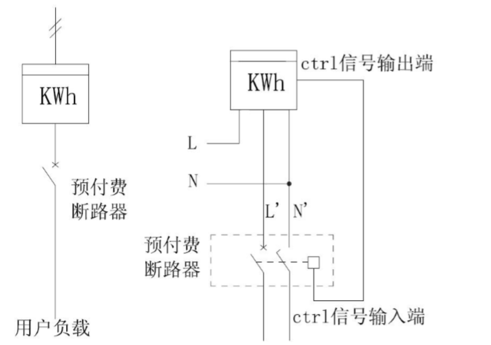 DDSY1352 单相电子式预付费电能表采用 35mm 标准导轨安装方式。 注:①接线时务必拧紧,避免因接触不良而引起电能表工作不正常;②电能表 ctrl 端子用于连接预付费表专用断 路器的 ctrl 信号输入端,以完成对负载回路的控制。控制示意图如下: