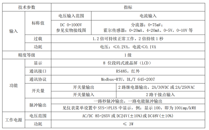 仪表可具有红外通讯接口和RS-485通讯接口,同时支持Modbus-RTU协议和DLT645-97(07)协议;可带继电器报警输出和开关量输入功能;根据不同要求,通过仪表面板按键,对变比、报警、通讯进行设置;具有开关量事件记(Modbus协议)、编程和事件设置记录(645协议)、数据瞬时和定时冻结功能(645协议)、电压电流功率值、最小值记录功能。