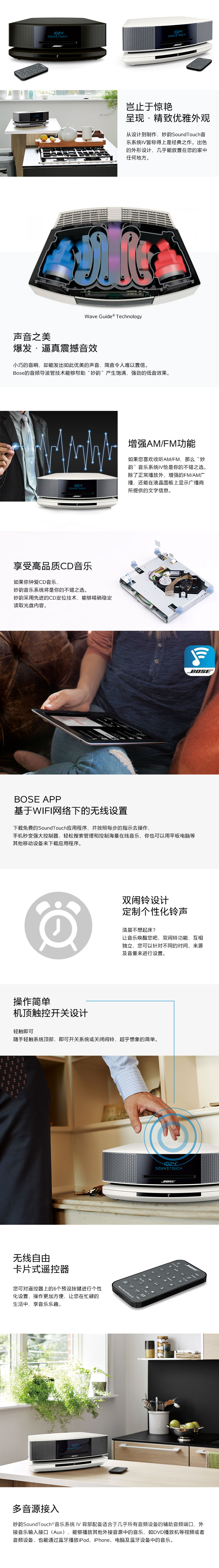 这款BOSE博士Wave SoundTouch妙韵3出色的音质非常适合当做家庭的主要音乐系统。它支持播放CD音乐及FM/AM广播。BOSE博士Wave SoundTouch妙韵3体积小巧,摆放在家里的任何位置都很合适。它的Bose®音频导波管技术和全新低音扬声器,音效饱满震撼,在家里的任何位置都能听得到。客厅、厨房、卧室——无论您身处何地,都能享受丰富流畅的音效。