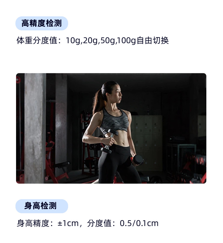 身高测量范围达0-210cm,分度值0.1cm;体重测量范围1-500kg,分度值0.1kg。