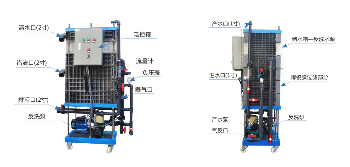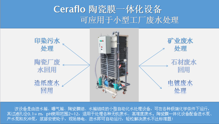 中空板式陶瓷膜一体化设备是由进水箱、曝气箱、陶瓷膜组、水箱组成的小型自动化水处理设备,核心部件为Ceraflo陶瓷膜片。该设备可在各种极端化学条件下运行,pH使用范围2~12,温度使用上限80℃,适用于各类无机废水、生活污水的处理和回用。该一体化设备配备进水泵、产水泵和反冲泵,底部安装轮子,现场接电、进水即可运行,可应用于小型工厂废水处理。