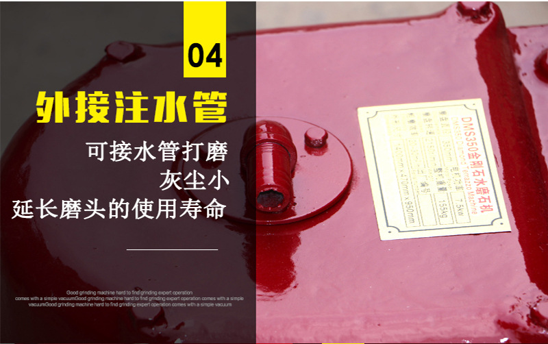 2.本机具有转速高压力适宜,运转平稳,中心水冷和磨盘角度自动微调等特点。性能可靠,是目前使用广泛的地面水磨石机。