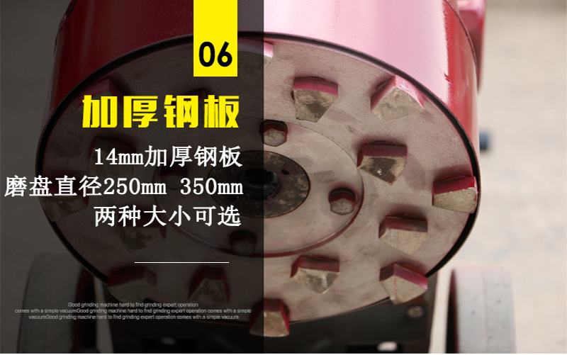 1.本机采用金刚石磨具,由于金刚石特别坚硬、锋利耐磨,所以该磨盘磨削地坪效率高、质量使用寿命长。