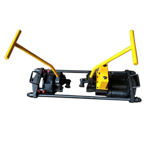 手握拔杆横粱将轨缝调整器置于单根轨面上,抬起搬杆,拨动斜铁外移,走行轮随杠杆下降压在轨顶面上,轨缝调整器被撑起,这样就可使轨缝调整器沿铁轨上行走,运送到串轨处。拉轨时,抬起后夹具体,推轨时抬起前夹具体,均两个夹具体工作。然后压下拨杆,拨动斜铁沿轨槽向内移动,斜铁牙面间距逐渐缩小,安装在走行机构上的杠杆及走行轮,随联动机钩上抬,机体下降。夹具体槽顶面落在钢轨顶面上,旋紧回油控制阀(右旋),摇动拄塞泵作往复运动将液压油压入工作缸,工作缸伸长到20-40毫米后,压紧斜铁,两对斜铁分别卡住两轨头的侧面,然后继续压泵,钢轨接头的缝隙随便可加大或缩小,轨缝达到要求尺寸后,停止压泵,左旋回油控制阀半周,工作缸复位,抬起拨杆,放松斜铁,串轨工作完毕。