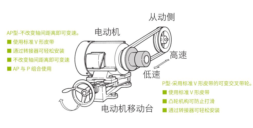 是采用标准V形皮带的可变交叉带轮,安装在电动机上以移动该电动机,强制改变挂在带轮上的皮带的节圆直径,从而改变转速。