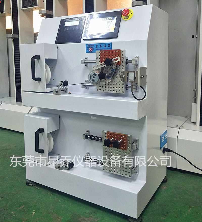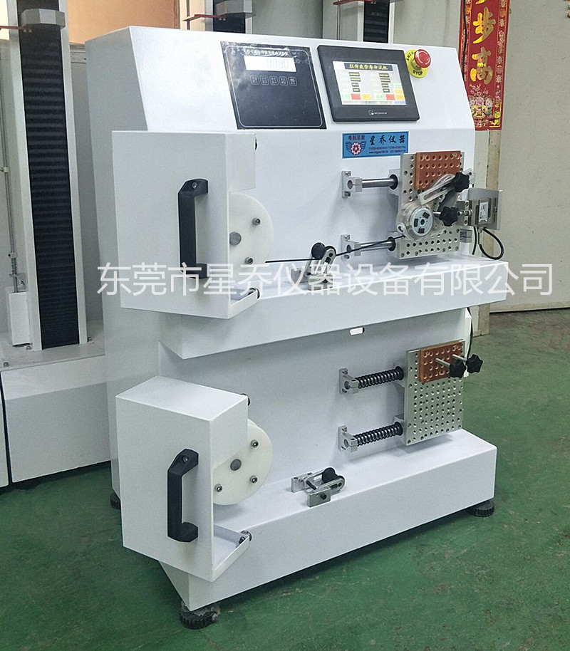 本机可分别对不同类型弹簧转动类弹簧线做拉伸回收往复疲劳寿命检测,模拟产品做拉伸回收动作,经试验至设定次数后测试产品的综合效果。本试验机在测试时具有,到次数停机,及产品损坏停机功能,是疲劳试验的专用设备。