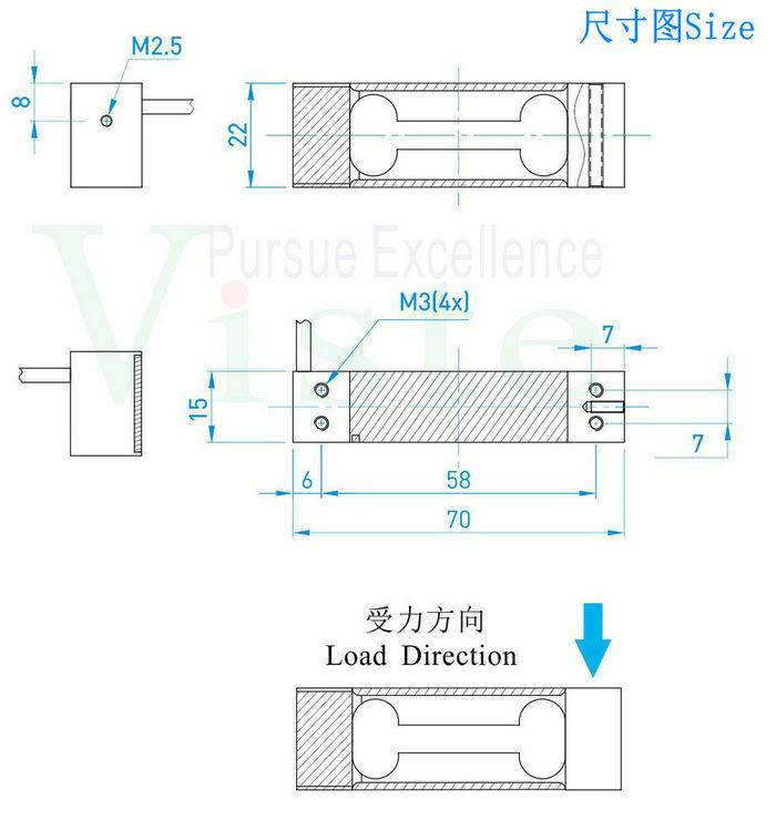 C3精度称重传感器VH70特点:小量程,高精度,易安装,抗偏载能力强,铝合金材料。模拟信号输出(mV/V)。可以配置变送器(V输出/mA输出)、数显仪表、plc控制。 可根据要求订制。
