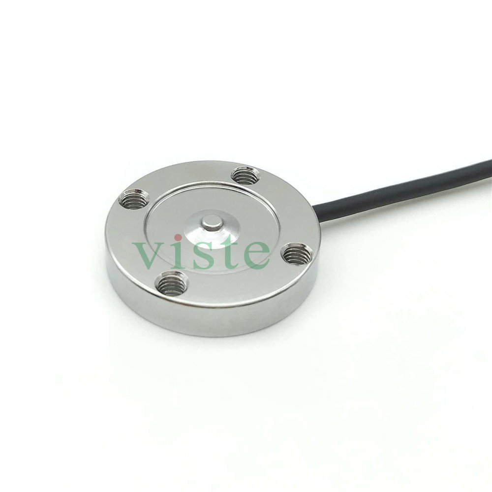薄型测力传感器VC20C特点:外径20mm,厚度4.5mm,带四个通孔螺丝孔固定。电阻应变式原理,可外接我司0-5V/0-10V/4-20mA信号放大器一起使用,可连接到PLC采集数据。