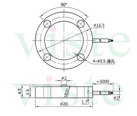 薄型测力传感器VC20C特点:外径20mm,厚度4.5mm,带四个通孔螺丝孔固定。电阻应变式原理,可外接我司0-5V/0-10V/4-20mA信号放大器一起使用,可连接到PLC采集数据。