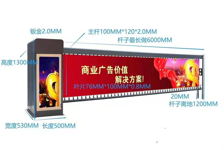 广告道闸,最长闸杆6米,闸杆百叶跟灯箱可制作广告张贴;道闸速度可调。使用方便、安全可靠、简洁大方、美观靓丽。广泛应用于各主要交通干道的沿街商圈、大型停车场、商住小区、商业广场、写字楼、餐饮酒店、高速公路、省国道收费站等交通要塞。控制方式有很多种,可根据不同情况选用手动控制、按钮控制、电脑控制和感应控制等操作模式;还具有坚固耐用,抗老化,不褪色,噪音低,运行安全,稳定可靠等特性。