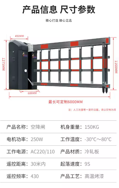 空降闸多用于机场、学校、火车站等场所,闸杆比常规款高度,强度更好。