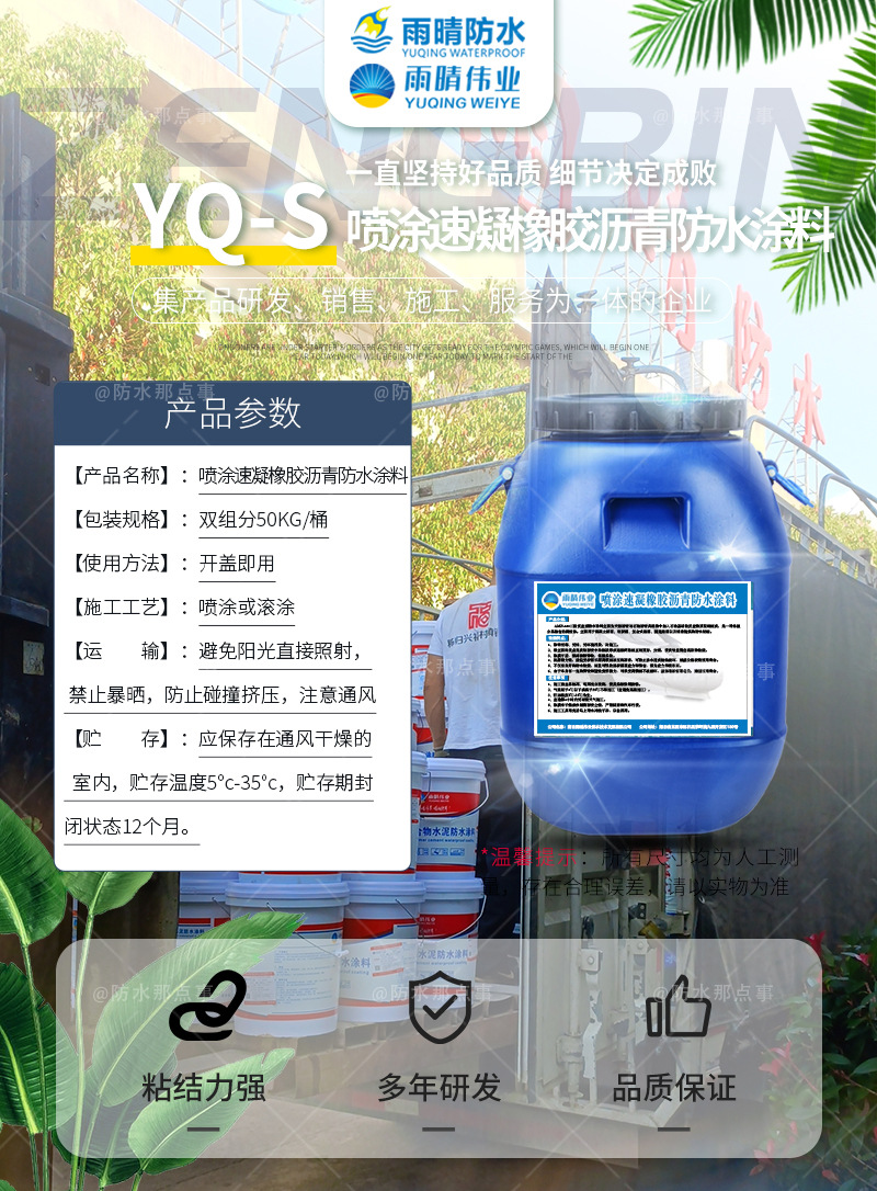 双组份雨晴防水喷涂速凝沥青道桥防水涂料,A组份为主剂,由特种合成橡胶乳液和采用特殊工艺制成的乳化沥青微乳液以及多种化学助剂混合完成,该组份是以橡胶为连续相,沥青为分散相组成的核壳结构体,其固含量较高,单粘度较低,适用于喷涂施工。B组份为促凝剂,是由金属盐类等电解质配制成相应浓度的水溶液。